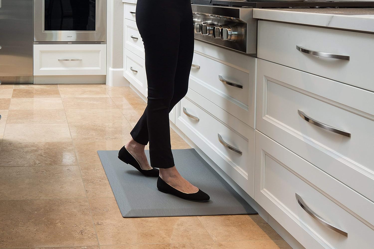 This cushioned floor mat helps reduce the fatigue caused by standing on hard surfaces.