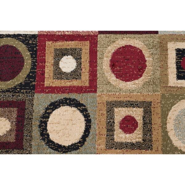 This fun and comfortable runner has a colorblock design that features tans reds blues and greens.
