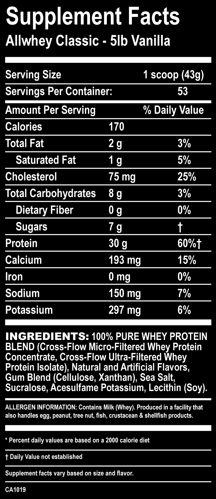 Classic allwhey 100 whey protein source.
